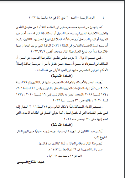 ننشر القانون رقم 153 لسنة 2022 بإعفاء 65% من مقابل التأخير والضريبة الإضافية والإعفاء ساري حتي اول مارس 2023